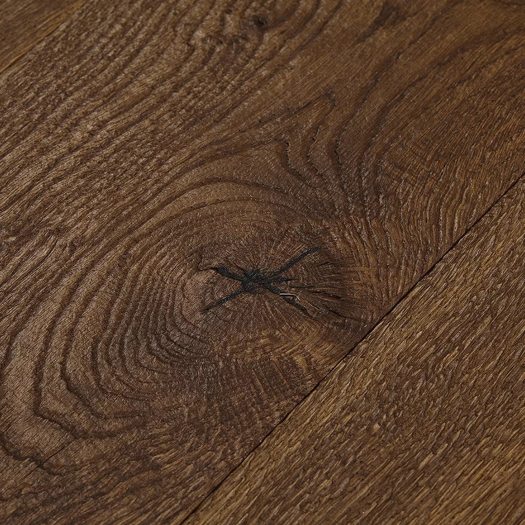 This is not a flat, uniform floor. Each plank is individually finished with deep distressing and a hand-scraped texture, giving it movement, variation and genuine character. You can see it, and you can feel it underfoot. No two boards are identical, which is exactly the point.